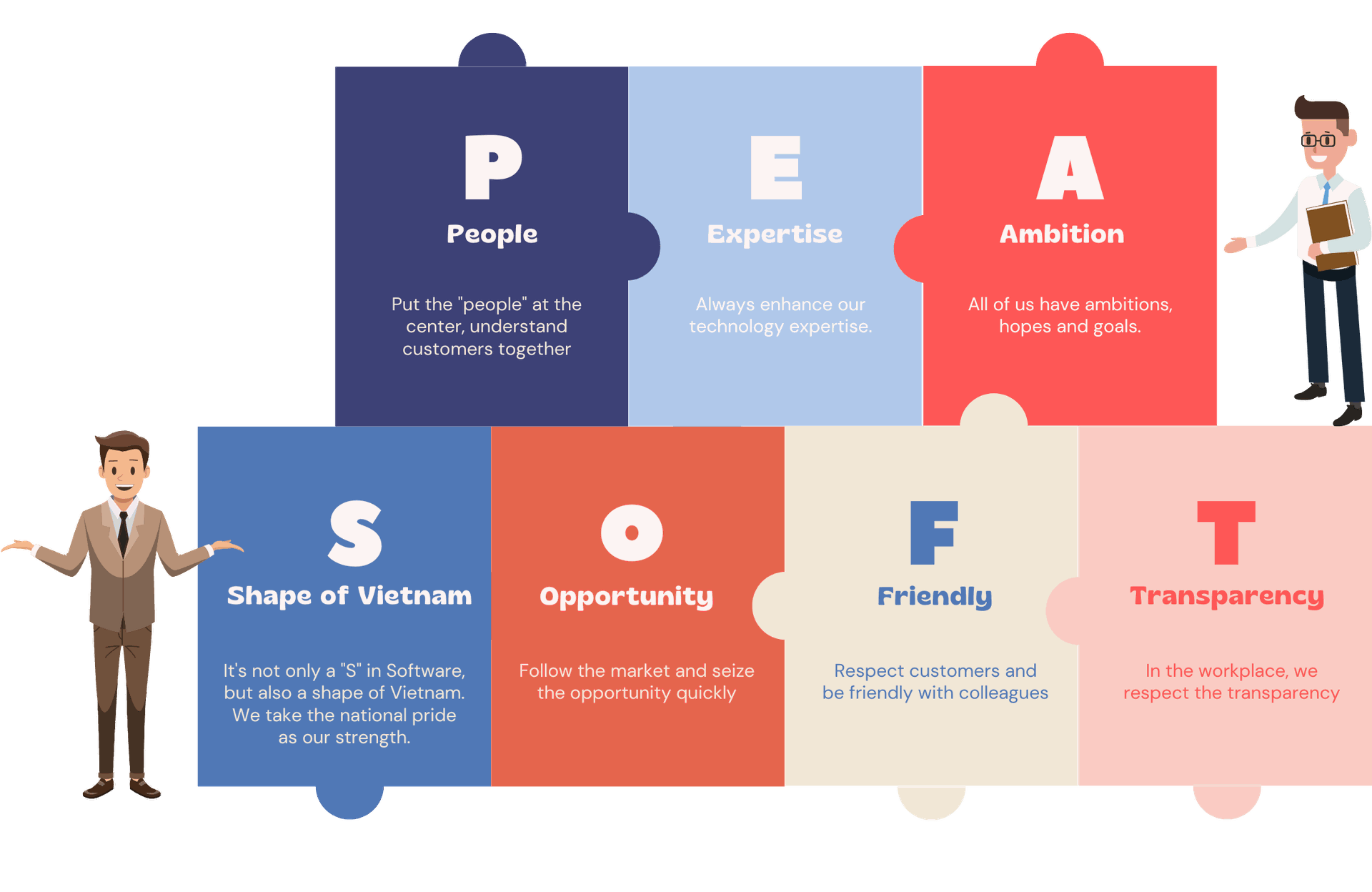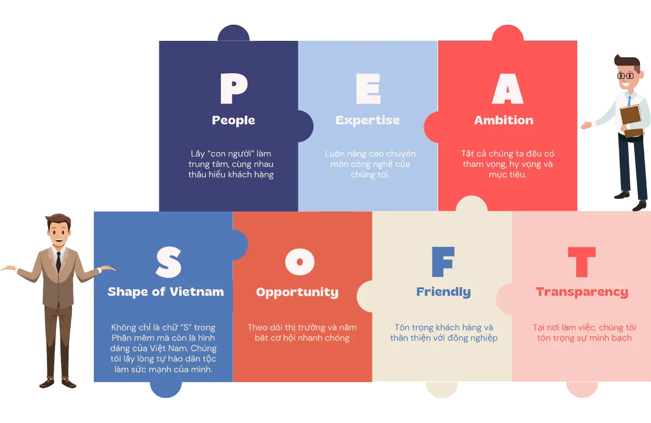Tại PeaSoft, mọi quyết định và hành động chúng tôi đưa ra đều xuất phát từ hai giá trị cốt lõi: tính sáng tạo và trách nhiệm. Chúng tôi cam kết không chỉ cung cấp các sản phẩm,