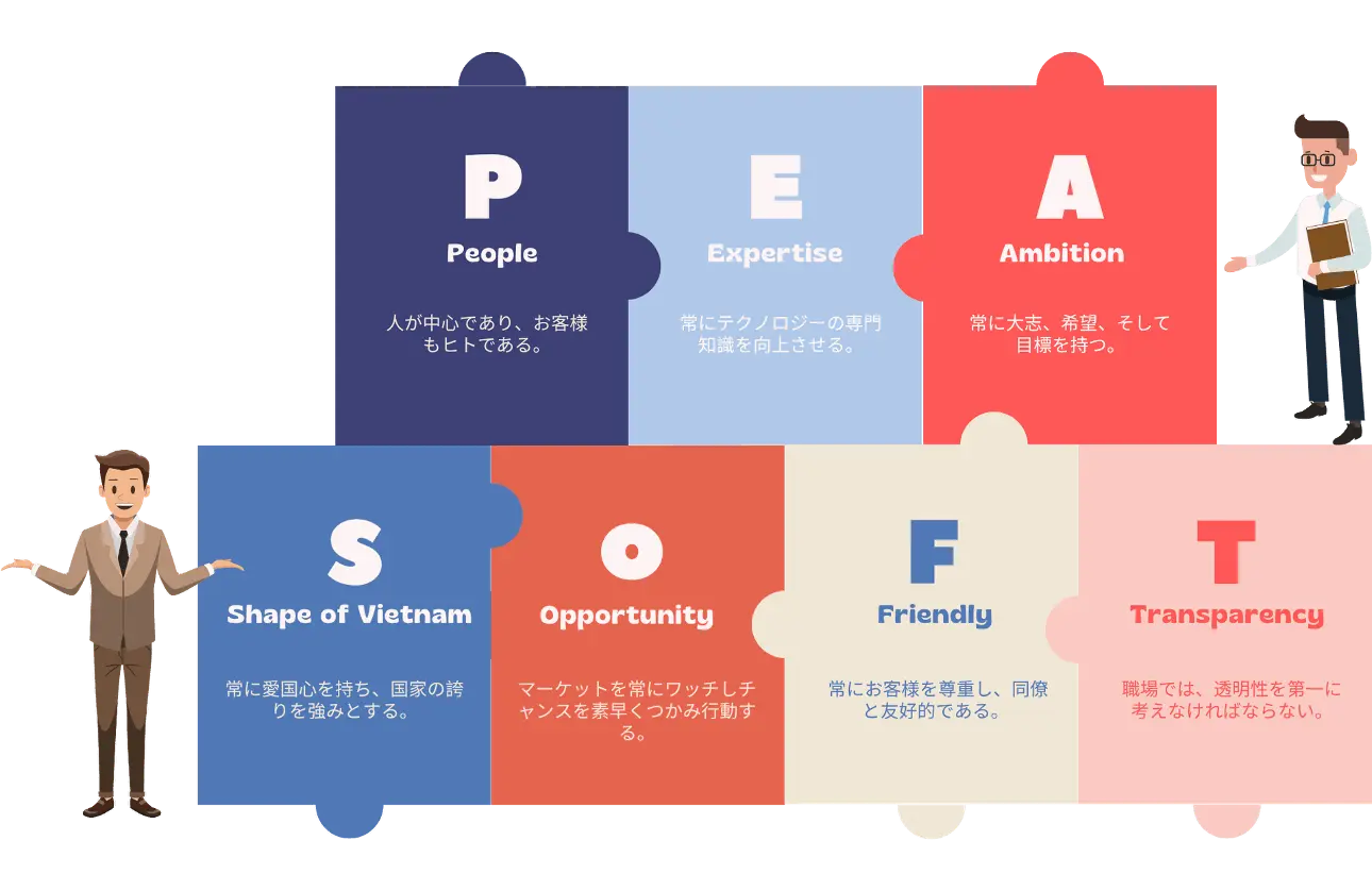 Tháng 3 năm 2024, PeaSoft Japan được thành lập, đánh dấu sự có mặt của PeaSoft tại xứ sở mặt trời mọc – Nhật Bản. Với tầm nhìn và sứ mệnh mang đến những giải pháp kinh doanh hiệu quả không chỉ trong nước mà còn trên toàn thế giới, PeaSoft đã và đang nỗ lực từng ngày và hy vọng tận dụng được cơ sở hạ tầng công nghệ cao, những khách hàng tiềm năng tại Châu Á để tạo ra những sản phẩm, dịch vụ công nghệ mới trên thế giới.